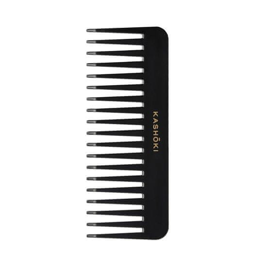 KASHOKI glavnik za česanje kodrastih las Glavnik Kashōki Kazuko je priporočljiv za česanje gostih, kodrastih in zapletenih las. Primeren je tudi za enakomerno porazdelitev kozmetike po laseh. Za uporabo na suhih in mokrih laseh. Kolekcija glavnikov Kashōki je zaradi modernega dizajna in velike pozornosti do detajlov eden najelegantnejših predlogov v segmentu dodatkov za oblikovanje las. Prednosti glavnika: Debeli, redko razporejeni zobje Izdelano iz močnega materiala Idealen za česanje kodrov in zapletenih las Primeren za porazdelitev kozmetike po laseh Lahek in udoben za uporabo Dobro se drži v roki Dimenzije: Širina glavnika 16 cm Dolžina zob 4,2 cm