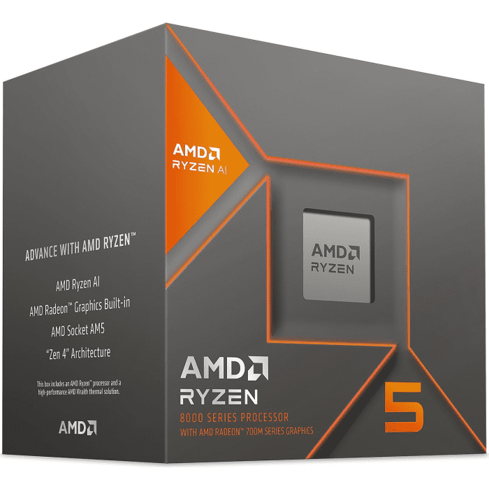 AMD Ryzen 5 8600G procesor AM5: Takt: 4.3GHz/5GHz, jeder/niti: 6/12, grafika: AMD Radeon 760M 2800MHz, tehnologija: TSMC 4nm, poraba: 65W. Vgrajene tehnologije: Zen 4, AMD EXPO Memory Overclocking Technology, PCIe 4.0, DDR5 5200, AMD FreeSync, AMD Ryzen AI. Celoten opis
