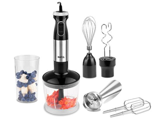 Ročni mešalnik z večnamenskim kompletom EMAVO – Visoka moč: 1000 W. – Vključena skodelica s prostornino 600 ml. – Rezilo iz nerjavečega jekla. – Nastavek za stepanje pene. – Dve vrsti nastavkov za mešanje. – Posoda za sekljanje z nožem iz nerjavečega jekla s prostornino 600 ml. – Rezilo za drobljenje ledu. – Turbo gumb. – Ohišje iz visokokakovostnih materialov. – Primerno za pomivanje v pomivalnem stroju. Večnamenski mešalnik EMAVO je pripomoček za posebne naloge, ki zelo olajša vsa kuhinjska opravila. Uporablja se za sekljanje, mešanje, drobljenje sadja, zelenjave, pripravo kremnih juh, omak, otroških juh, smoothijev itd. Vse elemente kompleta je mogoče enostavno ločiti in oprati, nekatere tudi v pomivalnem stroju. Z izbiro tega kompleta imamo pred seboj večnamensko napravo, enostavno za uporabo, ki je zelo uporabna v kuhinji!