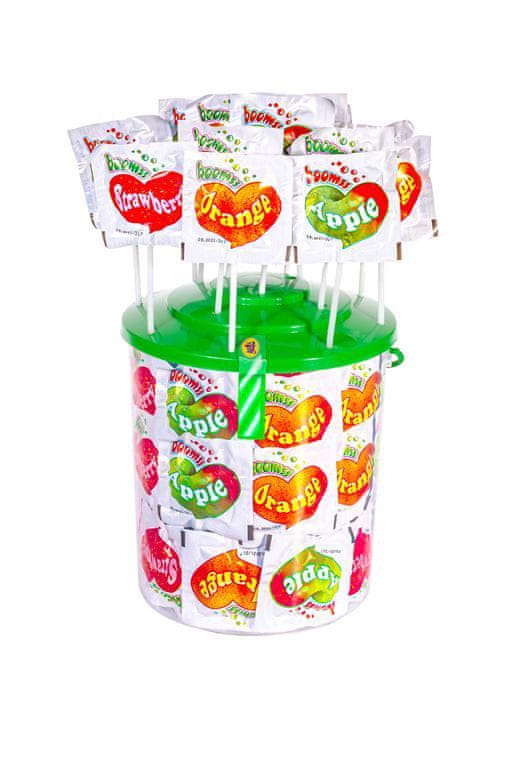 Astra sadna lizika v obliki srca 80×12g Sladke lizike v obliki srca s penečim nadevom z okusom sadja in rahlo penečim nadevom Vedro z ročajem + pokrov, ki služi kot stojalo za lizike Vsaka lizika je pakirana posebej.