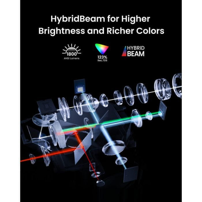 HybridBeam tehnologija za visoko svetlost: Naša povsem nova tehnologija HybridBeam združuje LED in laserske svetlobne vire ter zagotavlja svetlost 1.800 ANSI lumnov in 1,07 milijarde bogatih barv.