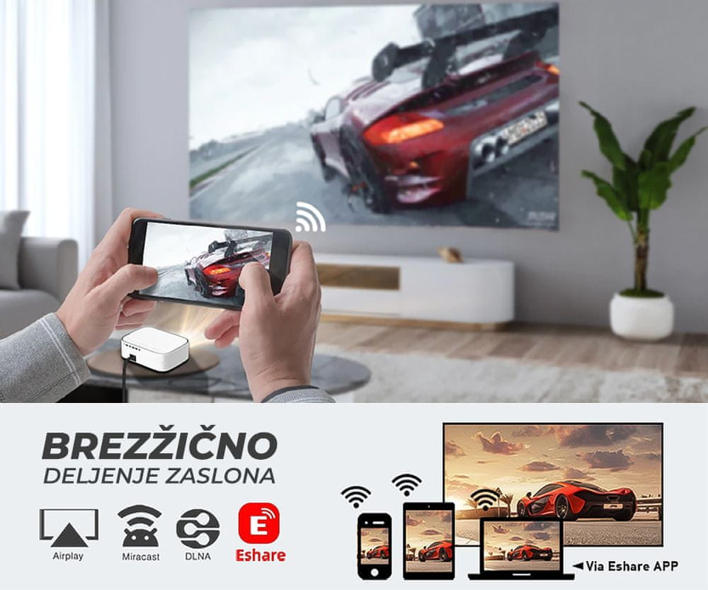 Projektor K45 podpira protokole AirPlay, DLNA, Miracast in Eshare za skupno rabo zaslona ali igranje iger s pametnega telefona / tabličnega računalnika ali druge naprave na zaslonu projektorja.