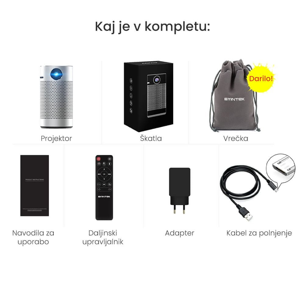 Byintek P7 prenosni mini LED DLP projektor, Android, Wi-Fi, 1080p, max. 4K-UHD, zvočnik
