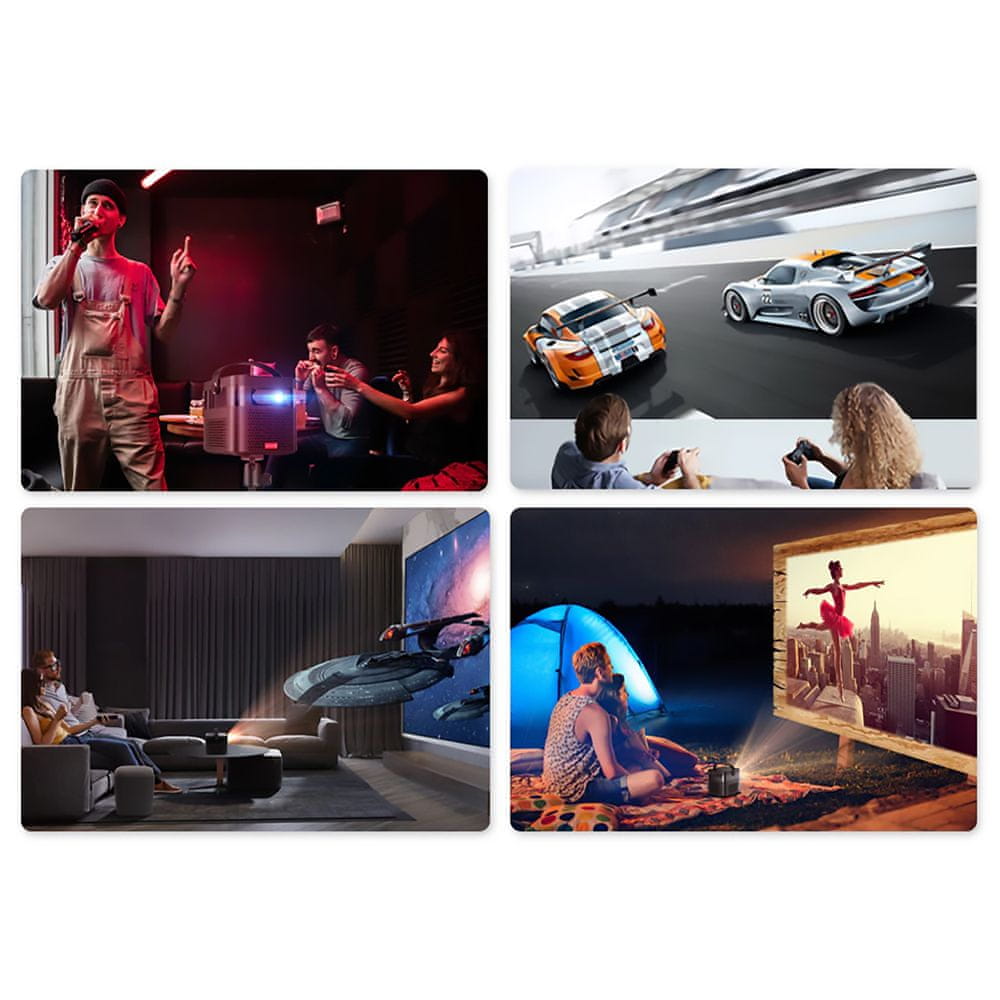 - Vsestranska uporabnost – družinska praznovanja, poslovne predstavitve v sejni sobi, oglaševanje, promocije, tematski večeri v dvorani, ogled filma doma, na terasi ali v naravi, brskanje po internetu, predvajanje slik, fotografij ali video posnetkov, igranje igric preko igralnega ploščka na velikem zaslonu, projekcija na avtodom ali počitniško prikolico, itd.