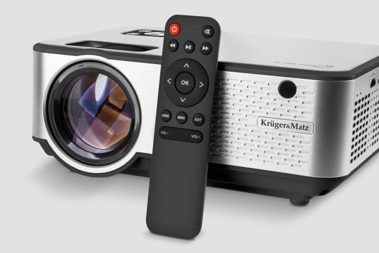 Domači projektor Kruger&Matz V-LED50 je prav tako priročen za uporabo. Komplet vsebuje daljinski upravljalnik, zahvaljujoč kateremu lahko na primer izberete vir predvajanja ali prilagodite glasnost, ne da bi vstali s kavča.