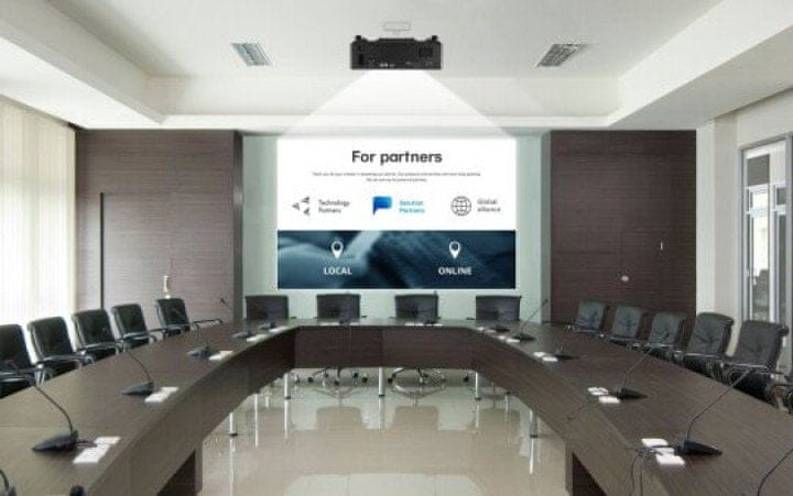 S svetilnostjo 7.200 ANSI lumnov omogoča projekcijo velikih slik do 300 palcev, tudi v prostorih z visoko stopnjo ambientalne svetlobe. WUXGA ločljivost (1920 × 1200) v razmerju 16 : 10 zagotavlja natančen prikaz podrobnosti, kar je ključno pri predstavitvah, grafih, videoposnetkih in tehnični vsebini. Dinamični kontrast do 3.380.000 : 1 poskrbi za globoke črne tone in odlično ločljivost slikovnih elementov.