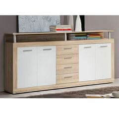 Komoda Antuzas v moderni barvni kombinaciji Artisan hrasta in antracit. Štirje priročni predali in dvoje vrat ponuja veliko prostora za shranjevanje.
