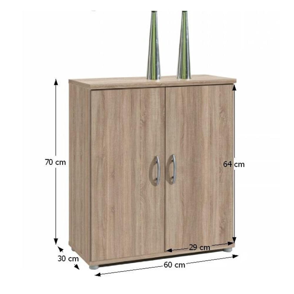 Z merami 60 cm v širino, 70 cm v višino in 30 cm v globinoje predalnik dovolj kompakten, da ga spravite tudi v manjše prostore, hkrati pa zagotavlja veliko prostora za shranjevanje zahvaljujoč dvojim vratom. Izdelan je iz visokokakovostnega aglomeriranega materiala s folirano DTD površinsko obdelavo, ki zagotavlja njegovo dolgo življenjsko dobo in enostavno vzdrževanje – le obrišite ga z vlažno krpo.