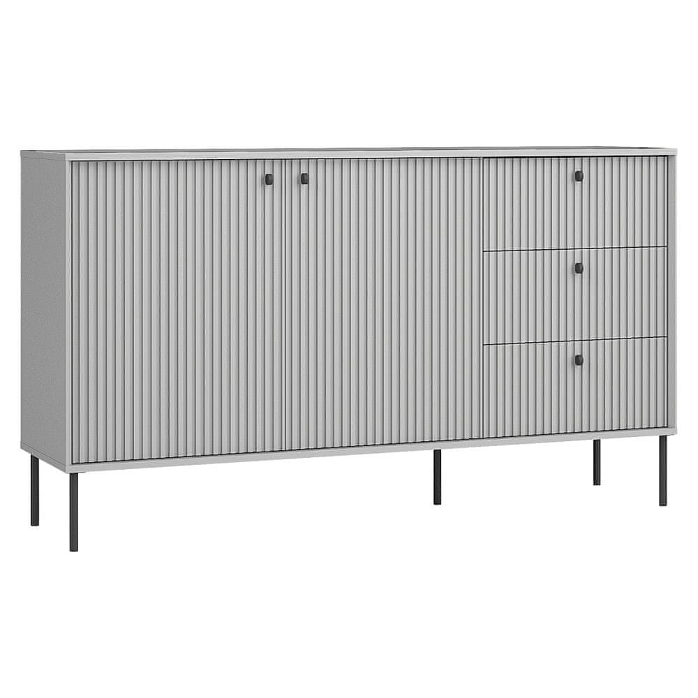 Dvodelna komoda ARIS 2D3S je praktičen in stilsko zasnovan kos pohištva, ki zagotavlja dovolj prostora za shranjevanje v obliki ene omarice z notranjo polico in treh prostornih predalov. Polica za vrati deli prostor na dve odlagalni površini, kar zagotavlja preglednost in organizacijo. Izdelana je iz kakovostne DTD in laminiranega MDF, z vzdržljivimi ABS robovi, ki povečujejo njeno življenjsko dobo. Komoda ima sivo barvno obdelavo in dimenzije (ŠxGxV): 156,2×40,5×89,2 cm z debelino materiala 1,6 cm. Vrata so dekorativna in dopolnjena s črnimi kovinskimi ročaji, ki se ujemajo s kovinskimi nogicami v isti barvi, visokimi 18 cm, kar olajšuje vzdrževanje tal pod komodo. Nosilnost police je 10 kg, zgornje plošče 20 kg in vsakega predala 8 kg. Komoda se ponaša s sistemom tihega zapiranja vrat. Za večjo varnost priporočamo, da komodo pritrdite na steno. Dostavljena je v razstavljenem stanju in se s svojim modernim dizajnom odlično prilega vsaki sodobni notranjosti.