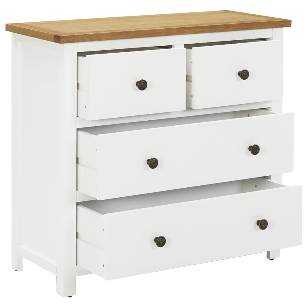 Ta predalnik ima površino iz trdne hrastovine in mediapana s hrastovim furnirjem ter ogrodje iz trdnega akacijevega lesa. Jasni vzorci lesa zagotavljajo, da je vsaka omarica malo drugačna od drugih. Še več! Štirje predali nudijo dovolj prostora za urejeno shranjevanje oblačil in manjših stvari.