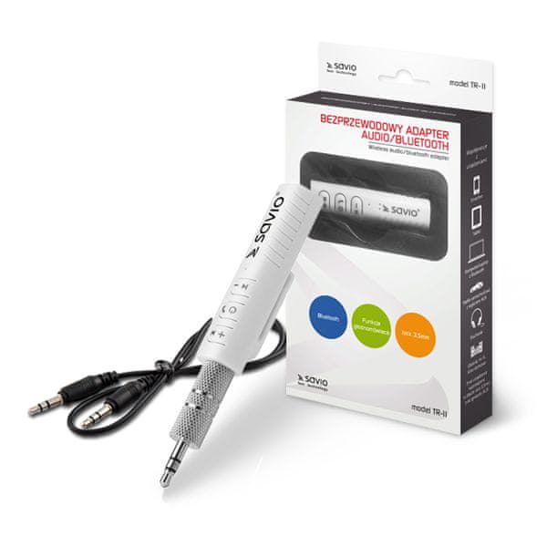 Brezžični vmesnik Bluetooth je kompaktna naprava, ki združuje značilnosti oddajnika Bluetooth in funkcije prostoročnega telefoniranja. Zahvaljujoč adapterju lahko hitro in udobno ustvarite brezžične slušalke iz žičnih slušalk, zvočnike Bluetooth iz žičnih zvočnikov ali uporabite oddajnik v avtu za poslušanje glasbe iz vašega telefona..
