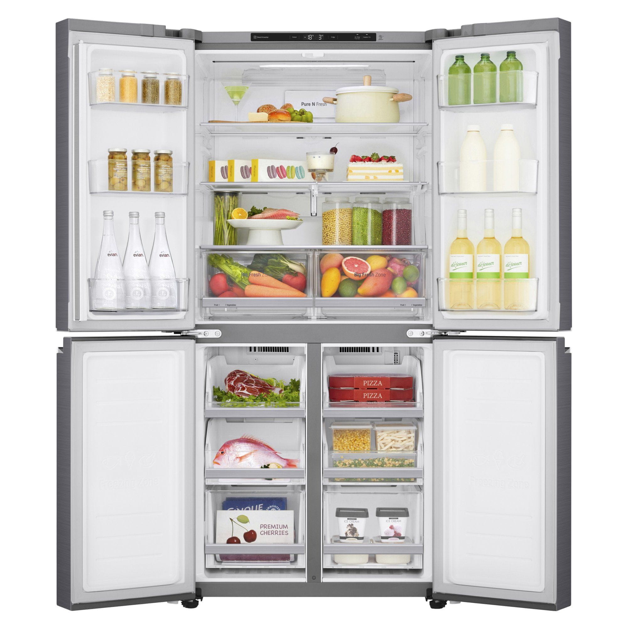 Ameriški hladilnik LG se ponaša z LINEAR Cooling™ in Door Cooling™ funkcijami s katerimi se hladilnik ohladi hitreje in bolj enakomerno, kar zagotavlja, da vse ostane sveže. Prostorna notranjost in pozornost do detajlov zagotavljata moderen in luksuzen videz znotraj in zunaj. Pri funkciji Moist Balance Crisp gre za posebno rešetkasto prevleko, ki vzdržuje optimalno raven vlažnosti. Vlaga iz živil, shranjenih v hladilniku, izhlapeva in kondenzira na mreži ter tako ohranja pravo ravnovesje zraka okoli živil. Pure N Fresh ščiti vaš hladilnik pred neprijetnimi vonjavami s sistemom zračnega filtra, ki vsebuje ogljik, ki ohranja svež zrak.