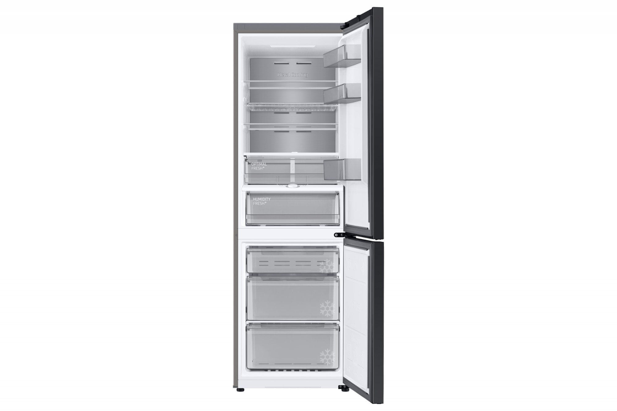 Eleganten prostostoječi kombinirani hladilnik s skupno prostornino 344 litrov spada v energijski razred E. Prostornina hladilnega dela meri 230 litrov, prostornina zamrzovalnika pa 114 litrov. Tehnologija SpaceMax pri standardni globini 60 cm zagotavlja več prostora za shranjevanje živil. Hladilnik se lahko pohvali z učinkovitim kompresorjem z digitalnim inverterjem, ki mu daje dolgo življenjsko dobo ter zagotavlja tiho in energetsko varčno delovanje. Sistem hlajenja z vseh strani poskrbi za optimalne pogoje shranjevanja najrazličnejših živil. Notranjost hladilnika enakomerno ohlaja od kota do kota zahvaljujoč premišljeno razporejenim šobam, kar dodatno podaljša svežino živil.