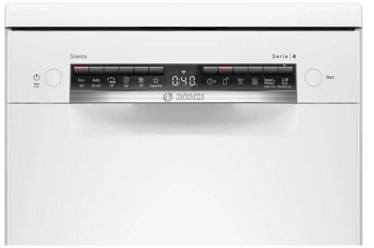Bosch pomivalni stroj nudi zmogljivost pomivanja 10 pogrinjkov in spada v energijski razred E. Ponaša se z izjemno tihim delovanjem, ki je ob izbiri programa Silence skoraj neslišno. Nudi enostavno izbiro med šestimi programi pomivanja in izbiro dodatnih funkcij za celovito čiščenje posod. Z možnostjo najljubše funkcije lahko preprosto nastavite svoje najpogosteje uporabljene programe in možnosti kot svojo najljubšo kombinacijo. Inovativni sistem košar VarioFlex nudi številne možnosti nastavljanja, po zaslugi trojnega sistema Rackmatic pa lahko višino zgornje košare enostavno prilagodite na tri nivoje. S funkcijo ExtraDry z daljšo fazo sušenja temeljito posuši posodo, da jo lahko brez skrbi pospravite v omaro. Ima samočistilni filter s 3-slojnim valovitim sistemom filtriranja. S pametno povezljivostjo lahko v aplikaciji HomeConnect odkrijete priročne funkcije za uporabo aparata, kot je obvestilo o pomanjkanju tabletk.