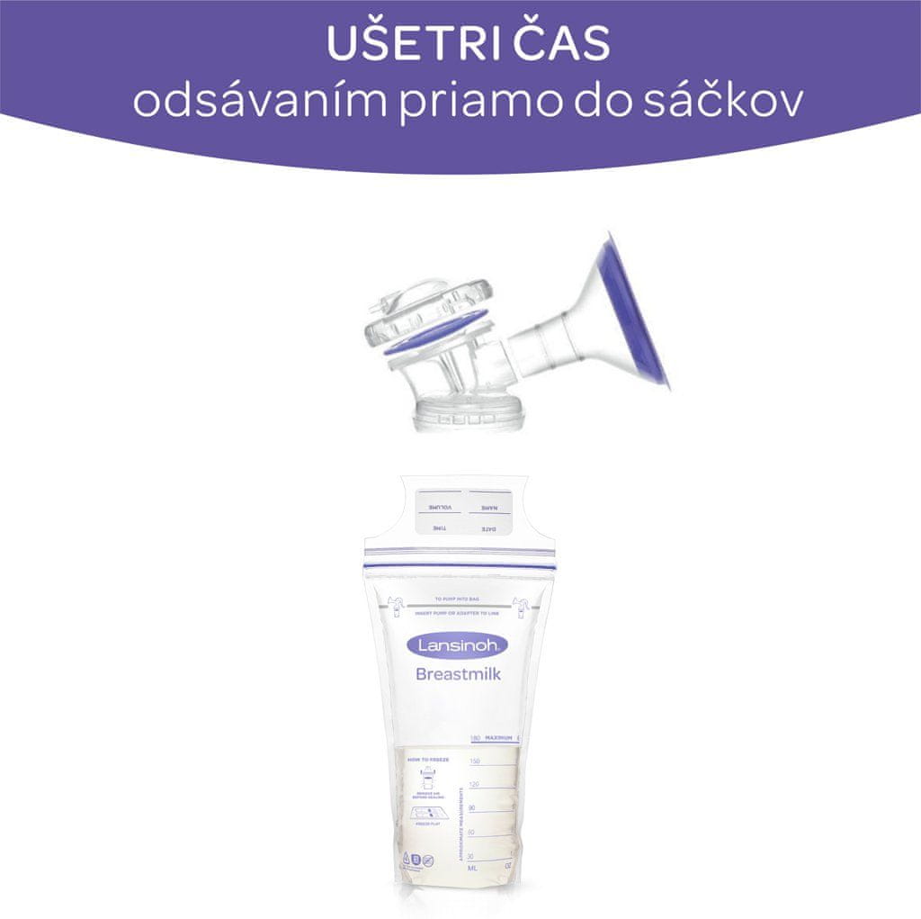 S kompaktno enojno električno prsno črpalko Lansinoh lahko črpate neposredno v vrečke za shranjevanje materinega mleka Lansinoh, s čimer prihranite čas in preprečite razlitje mleka pri prenašanju mleka iz stekleničk v vrečke. Črpanje neposredno v vrečke je v veliko pomoč, kadar ste na poti in nimate dovolj prostora za stekleničke za shranjevanje mleka.