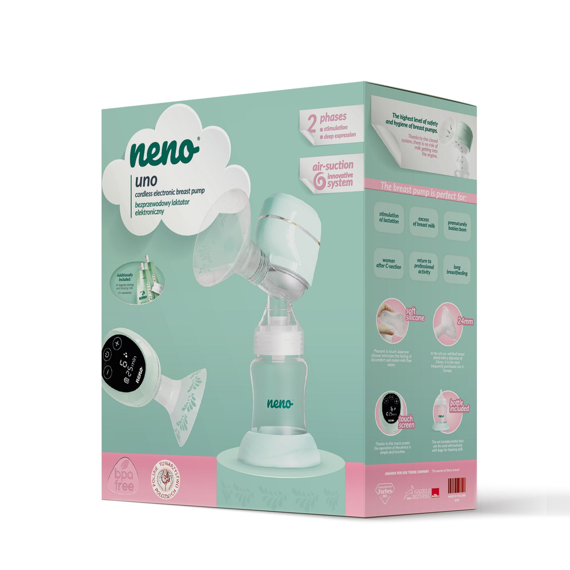 Neno je vodilna poljska blagovna znamka, ki ponuja elektronske črpalke za dojke in druge dodatke, ki podpirajo zdravo dojenje. Naše črpalke za dojke so prejele uradno priporočilo Poljskega združenja babic. Nedvomni uspeh blagovne znamke potrjujejo tudi prestižne nagrade: Made in Poland, Forbes Diamonds, Parents' Choice 2022, Customer Laurel — Discovery of the Year 2022 in Business Gazelles.