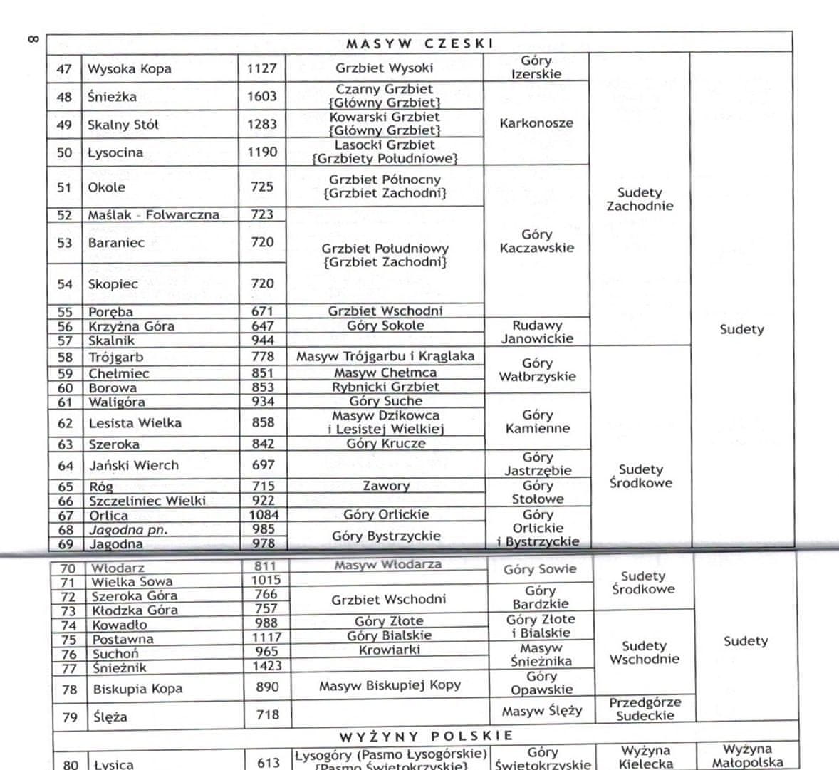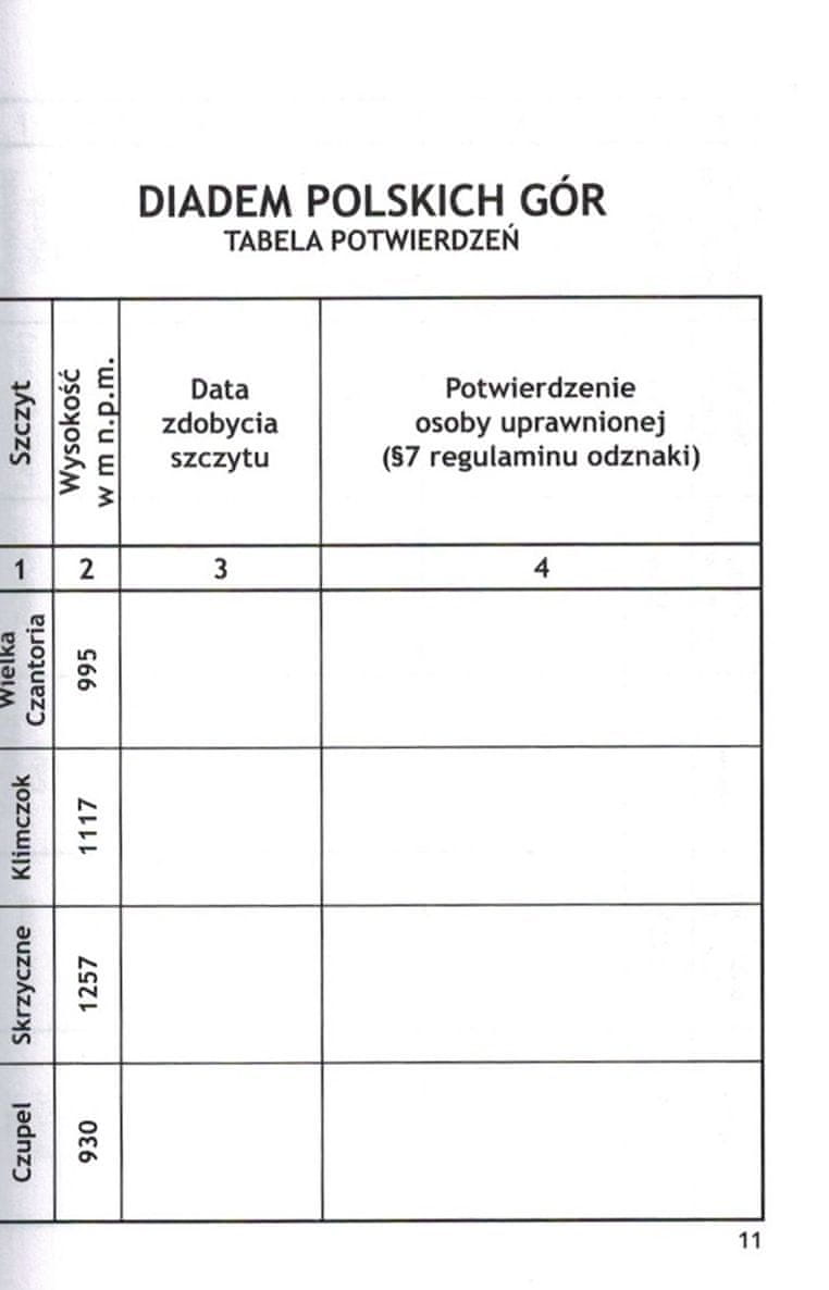 Knjižica »Diadem Polskich Gór« vsebuje 80 poljskih vrhov. Vrhove, ki jih je treba osvojiti in so zapisani v knjižici, je mogoče osvojiti v obratni smeri ali v poljubnem vrstnem redu. Knjižica vsebuje pravila za pridobivanje značk, mesto za zbiranje potrdil in seznam krajev.