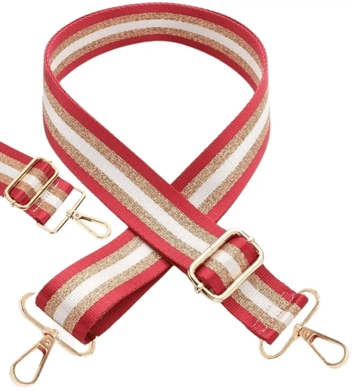 Njegova širina 38 mm zagotavlja udobno nošenje, ne da bi se zarezal v rame, in nastavljive dolžine od 75 cm do 145 cm omogočajo prilagoditev glede na vaše potrebe. Zahvaljujoč večbarvnemu dizajnu, ki združuje rdečo, bež in belo, postane idealen dodatek za vsako torbico, ki poudarja vaš osebni stil.