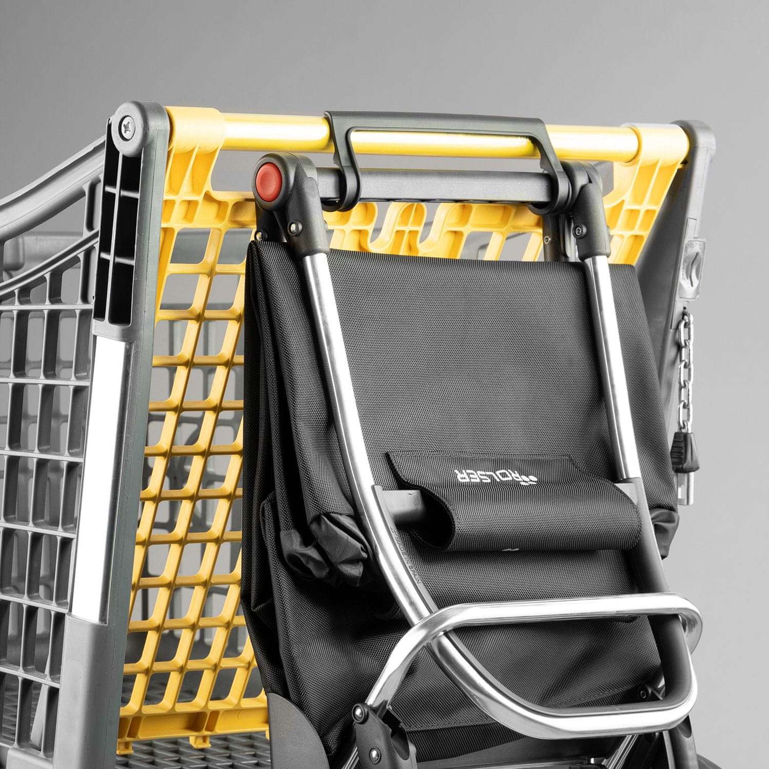 Ogrodje je izdelano iz lahkega aluminija. Voziček lahko s pritiskom na gumba na obeh straneh hitro zložite (prepognite ga naprej, v smeri torbe). Zlaganje vozička je prikazano na slikah v zloženki. Zložen voziček lahko obesite na nakupovalni voziček v trgovini.