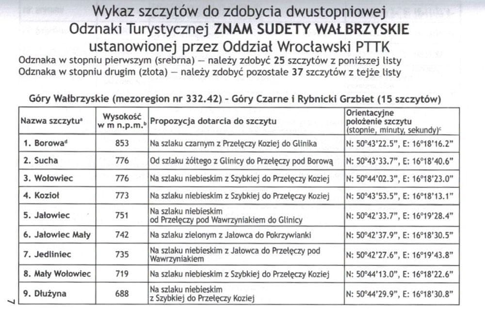 Knjižico turističnih značk »Znam Sudety Wałbrzyskie« je ustanovila vroclavska podružnica PTTK v Vroclavu. Knjižica vsebuje seznam 62 vrhov, ki jih je treba osvojiti, pravila za pridobitev značke in prostor za potrditev.