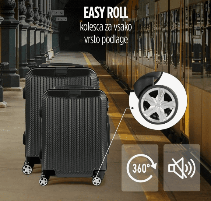 4 dvojna 360° vrtljiva kolesca omogočajo tiho in varno vožnjo v katerokoli smer, brez zatikanja. Njegova izjemna praktičnost se kaže v nastavljivem teleskopskem ročaju, ki ti olajša prevoz še tako težke prtljage. Enostavno si ga prilagodi na primerno višino.