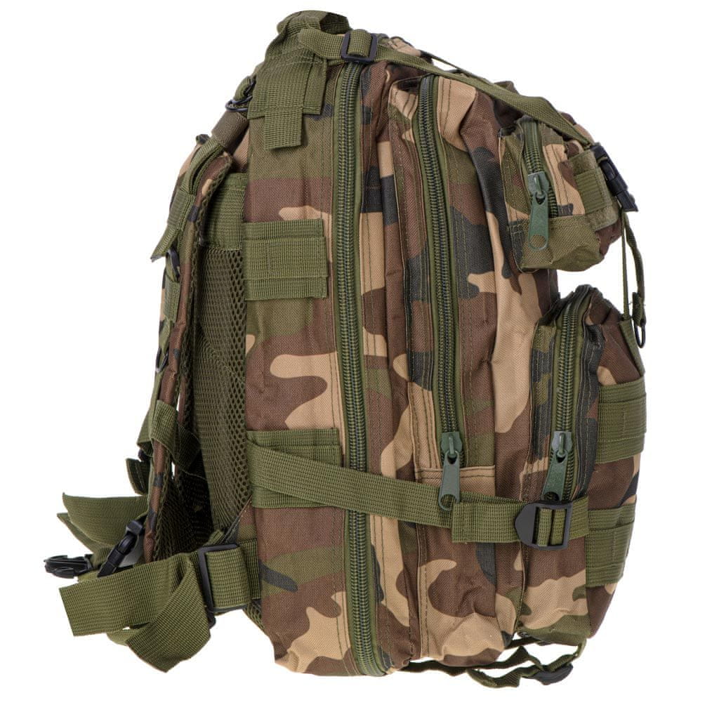 TAKTIČNI VOJAŠKI POHODNIŠKI NAHRBTNIK 25L CAMO Praktičen in celo obvezen dodatek med katero koli vojaško ali preživetveno ekspedicijo! Odlična zmogljivost. Skupna prostornina nahrbtnika je 25 litrov, sestavljena iz petih žepov, vključno z dvema glavnima za največje predmete. Vsak ima vgrajene manjše predalčke, ki zagotavljajo čim več prostora za uporabne stvari in olajšajo organiziranost med potovanji. Vsi zunanji žepi se zapirajo za zaščito vaših stvari. Nahrbtnik ima tudi stranske in spodnje kompresijske trakove za prilagoditev zmogljivosti in velikosti nahrbtnika opremi, ki jo prenašate. Priročnost uporabe. Pasovi so nastavljivi od zgoraj navzdol, da se lažje prilagodijo vaši postavi. Nahrbtnik ima tudi pas za boke in prsi, ki bo razbremenil vaša ramena in poskrbel za enakomerno porazdelitev teže med dolgimi potovanji. Hrbtni del nahrbtnika in naramnice so dodatno ojačane in izdelane iz zračne mrežice. Vsestranska uporaba. Nahrbtnik bo kot nalašč za vse ljubitelje vojske, taborništva, taborništva, pohodništva, pa tudi za vse, ki iščete praktičen in prostoren nahrbtnik za vsak dan. Visoka kakovost izdelave. Sama obdelava in material zagotavljata odpornost na kakršno koli trganje ali odrgnino, zato ste lahko prepričani, da bo vaša oprema na vsaki odpravi varna. Barva: kamuflažna Material: poliester Kapaciteta: 25l Število žepov: 5 Mere: Nahrbtnik: 45 cm x 22,5 cm x 21,5 cm Dolžina naramnic pri maksimalnem iztegu: 53 cm Dolžina bočnega pasu pri maksimalnem iztegu: 58 cm Večji sprednji žep: 18 cm x 22 cm Manjši sprednji žep: 18 cm x 8 cm Pakiranje: 27 cm x 48,5 cm x 6 cm Pakirano v folijski embalaži.