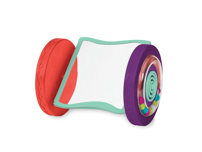 Valjček med kotaljenjem po tleh drsi, ogledalo pa ostane pokonci. Otroka spodbuja k plezanju in tako razvija njegove motorične sposobnosti. Dimenzije: 24 × 16,5 × 19 cm. Primerno za otroke od rojstva do 2. leta starosti. Celoten opis