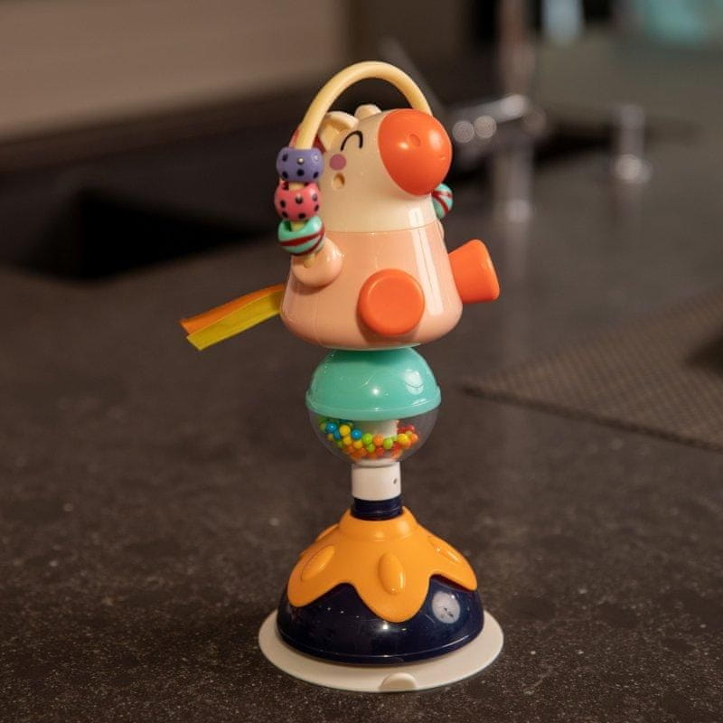 Plastična igrača s priseskom, ki se pritrdi na jedilno mizo in otroku preprečuje, da bi jo vrgel na tla. Celoten opis