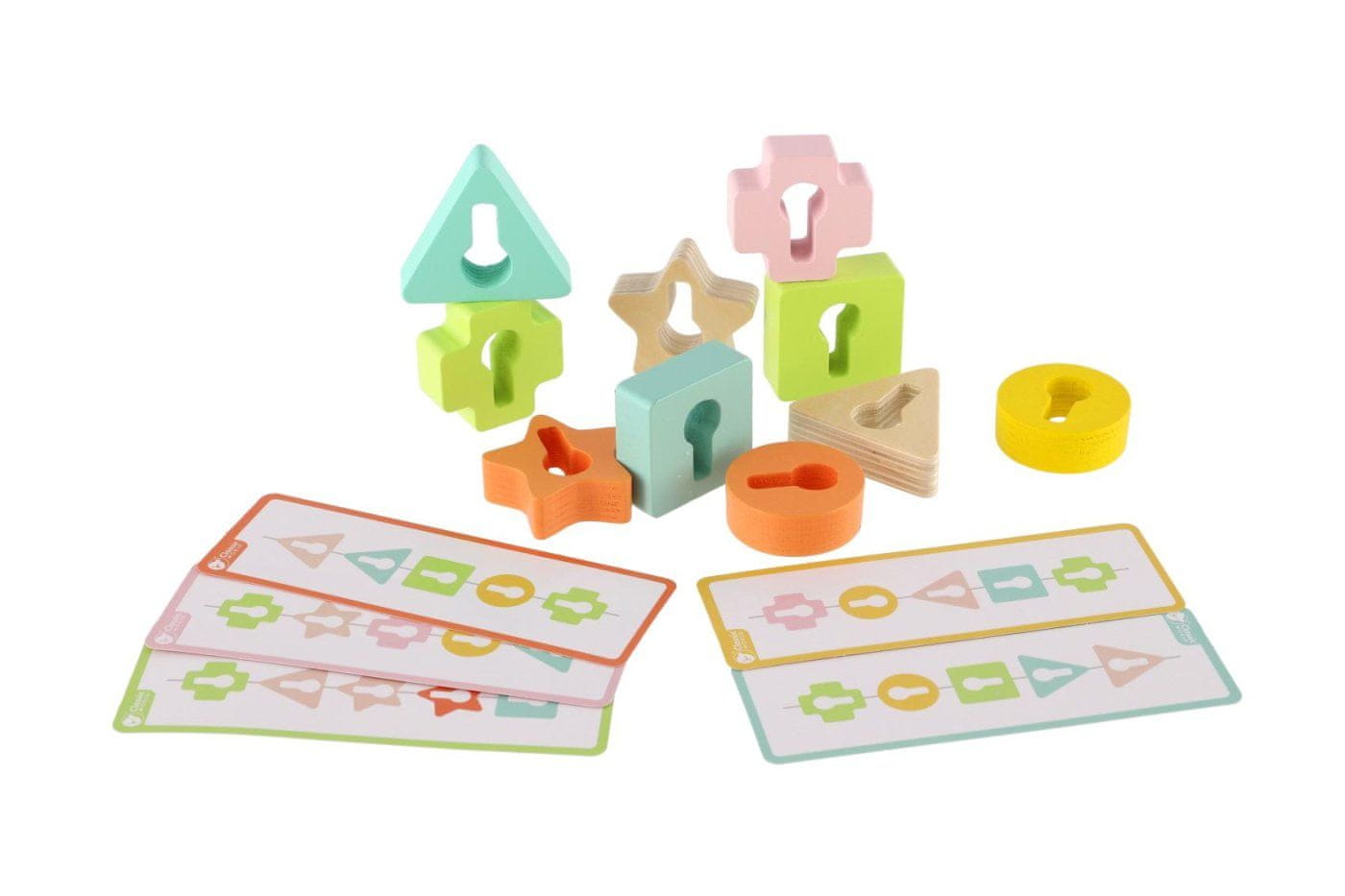 Otroci lahko potisnejo ključ skozi različne oblike in poskušajo odpreti vrata z lesenim ključem. Otroci bodo spoznali različne oblike in vadili svoje fine motorične spretnosti. Paket vsebuje 11 lesenih kosov. Velikost škatle 20 × 20 × 5 cm Primerno za otroke od 18. meseca dalje.