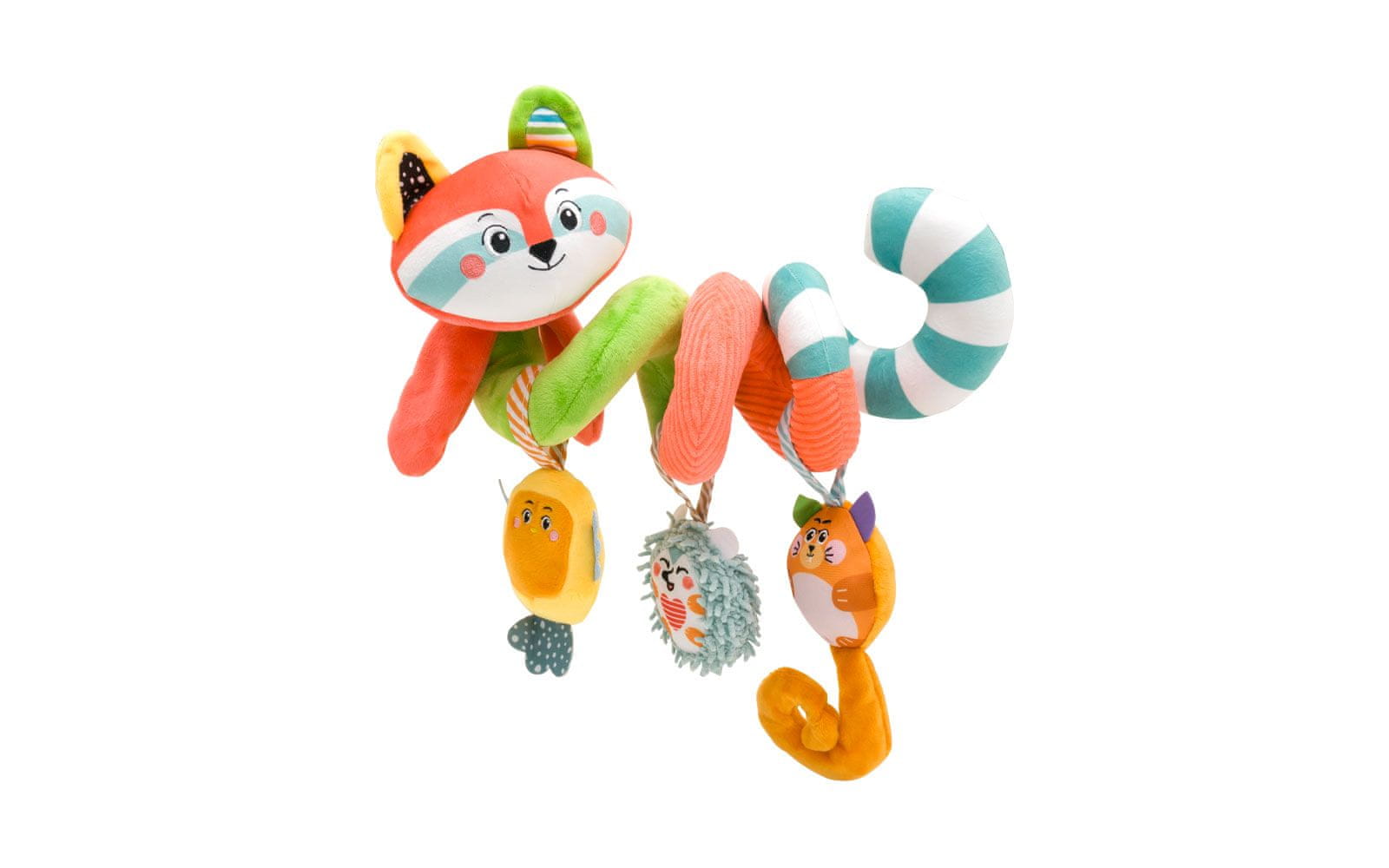 Večbarvna baby spirala z obeski živalic, Clementoni. Prikupni rakunček in njegovi nežni prijatelji iz gozda poskrbijo za razvedrilo in zabavno otroško igro – otrok otipa različne materiale, ob tem pa ga spremljajo žive barve. Prikupen obesek ljubke veverice ima mehak repek z nabranim učinkom, ježek in ptiček pa imata v notranjosti ropotuljico. Ta čudovita igračka spodbuja otrokove spretnosti ter vidno in slušno zaznavanje.