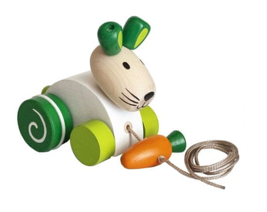 Igrača za vlečenje v obliki zajca, ki nosi korenček. Celoten opis