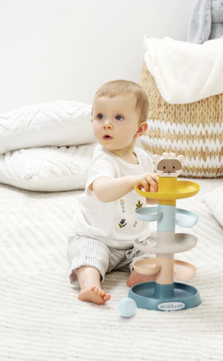 Vzidalni stolp za najmlajše v nežnih barvah z žogicami in glavo medvedka na vrhu. Z njim otrok trenira motorične sposobnosti in koordinacijo. Dimenzije stolpa (DxŠxV): 16,5 × 16,5 × 34 cm.