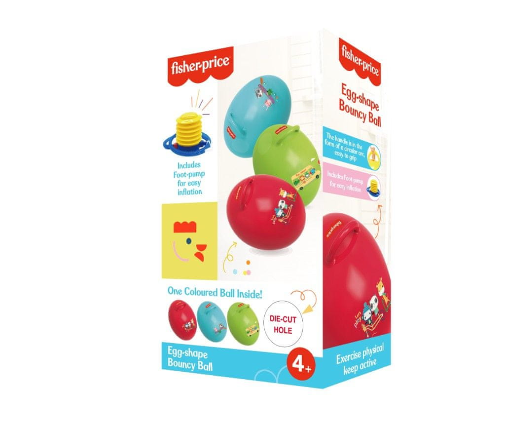 Fisher-Price odbojna žoga v obliki jajca bo čudovito zabavala otroke. Ta odbijajoča žoga pomaga razvijati otrokove motorične sposobnosti, ravnotežje in koordinacijo. Ima praktičen ročaj. Velikost napihnjene igrače je 45 × 35 × 35 cm. V paketu je priložena črpalka, s katero lahko poskočno žogo preprosto napihnete. Primerna je za otroke od 4. leta starosti dalje.