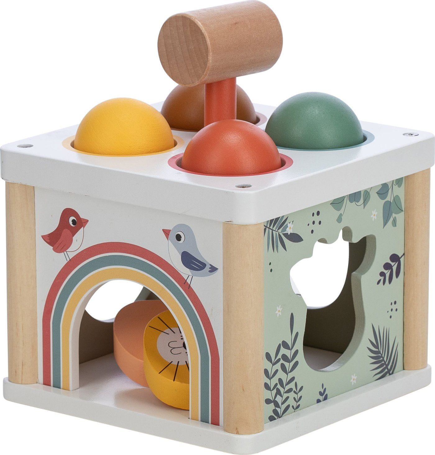 S kladivom udarite žogice, ki so postavljene na vrhu škatle. Priložene so tudi figurice živali, ki jih lahko potisnete skozi ustrezne luknje.