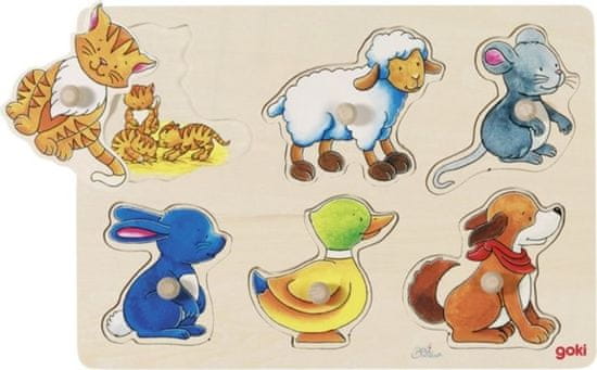 Lesena sestavljanka z motivom živali. Pod vsakim delom se skriva slika dojenčka.