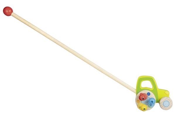 Dimenzije: dolžina palice 50 cm, traktor 17 × 14 cm. Primerno od 18. meseca starosti. GOKI je eden najpomembnejših evropskih proizvajalcev igrač visoke pedagoške in didaktične kakovosti. Podjetje poudarja varnost igrač, njihovo zdravstveno neoporečnost in skrb za obnovljive vire. Les se pridobiva tam, kjer lahko raste. Uporabljajo se naslednje vrste lesa: javor, bukev, oreh, lipa, jesen, bor, breza in kavčukovec. Barve in laki so nabavljeni pri manjših proizvajalcih.
