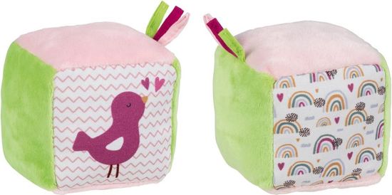 Ta mehka kocka za dojenčke in malčke je idealna igrača za gibalne dejavnosti, ki na igriv način spodbuja otrokova čutila. Z vgrajenim zvončkom in šumečo folijo zagotavlja slušno stimulacijo in spodbuja razvoj sluha. Hkrati priložene zanke in trakovi zagotavljajo odlično priložnost za taktilno zaznavanje – raziskujejo in izboljšujejo otrokovo fino motoriko. Igrača spodbuja koordinacijo oko-roka, fino motoriko in razvoj otrokove domišljije. Zgornji del kocke je izdelan iz tekstila, medtem ko je notranjost kocke izdelana iz mehkega polnila. Dimenzije kocke: približno 8 × 8 × 8 cm. Primerna za ročno pranje pri 30°.