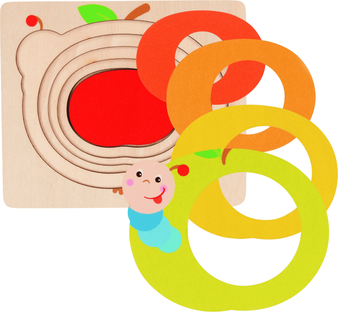 Večplastna sestavljanka z motivom jabolka in gosenice. Sestavljanka vsebuje pet delov. Prednosti: