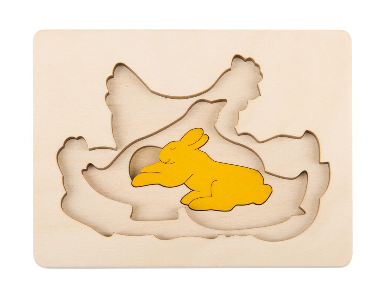 Lesena večplastna sestavljanka z motivom živali. Prva plast je kokoš s piščanci, druga plast je raca z račkom, tretja plast pa je majhen zajček. Kosi so položeni v leseno ploščo z izrezanim obrisom. Zlaganje sestavljank razvija fino motoriko, logično mišljenje in koordinacijo oči in rok. Sestavljanka za vstavljanje je izdelana iz visokokakovostnega lesenega materiala in je primerna za otroke od 3. leta starosti. Opomba: Priporočamo, da zadnjo platnico obdržite kot predlogo za pregibanje. Velikost zložene sestavljanke je približno 15 × 11 cm.