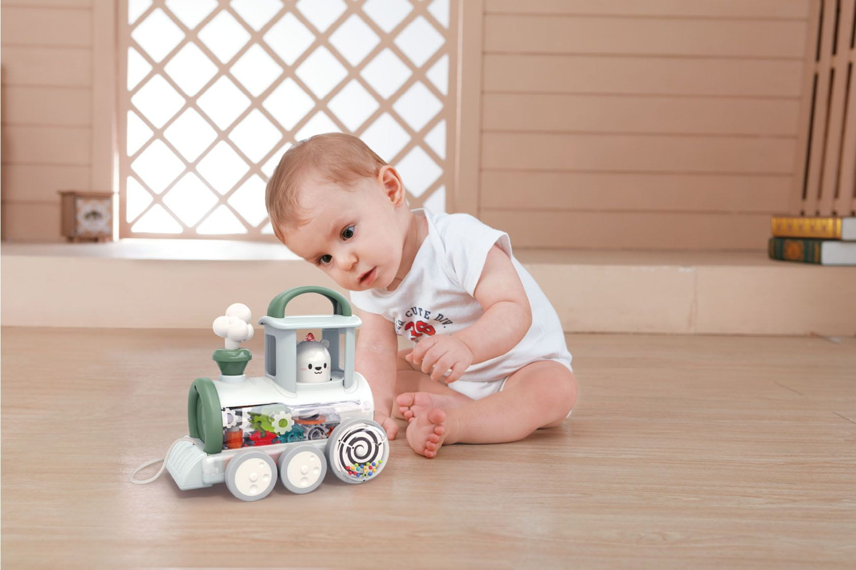 Vlakec ima osnovno inženirsko strukturo in premično zasnovo, ki razsvetljuje otrokovo zanimanje in spodbuja dojenčkovo plazenje. S prijemom, potiskanjem in vlečenjem lahko izboljša spretnost otrokovih prstov, motorične sposobnosti in senzorični razvoj. Primeren za otroke od 6 mesecev naprej.