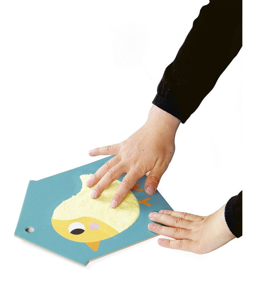 Taktilne kartice JANOD z motivom kmečkih živali. Na vsaki kartici je del, prekrit s posebnim premazom za čutno zaznavanje – krzno, semiš, usnje itd. Igrajte se s karticami in spoznajte živali, ki jih lahko srečate na podeželju. Otroci lahko kartice vzamejo s seboj, kamor koli gredo. Zaradi obroča jih je enostavno držati v majhnih rokah in vaš malček jih bo imel vedno pri roki. Paket vsebuje 7 pisanih slikovnih kartic na obročku. Velikost ene kartice je približno 16 × 18,5 cm. Primerno za otroke od 12. meseca dalje.