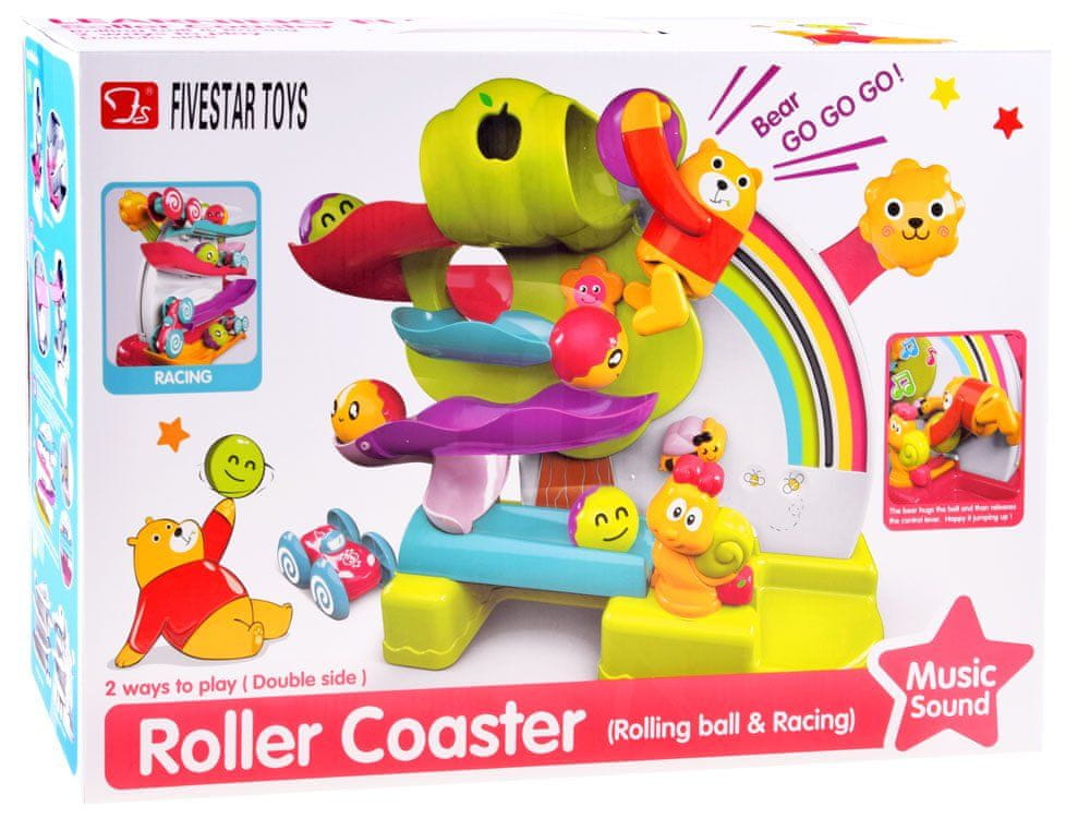 stezo sestavljajo štiri stopnje Na spodnji stezi sta obe kroglici postavljeni tako, da se ustavita pri polžu. Ko potegnete ročico z levjo glavo, medved izvede salto in ujame žogo. Medvedek ponovno sprosti vzvod, se zavrti in vrže žogico v najvišjo stezo. Žogica se kotali po progi, spremlja pa jo vesela glasba z nastavljivo glasnostjo. Možno je tudi predvajanje brez glasbe (stikalo se nahaja na beli plošči). Igračo napajata 2 x bateriji AA (nista priloženi).