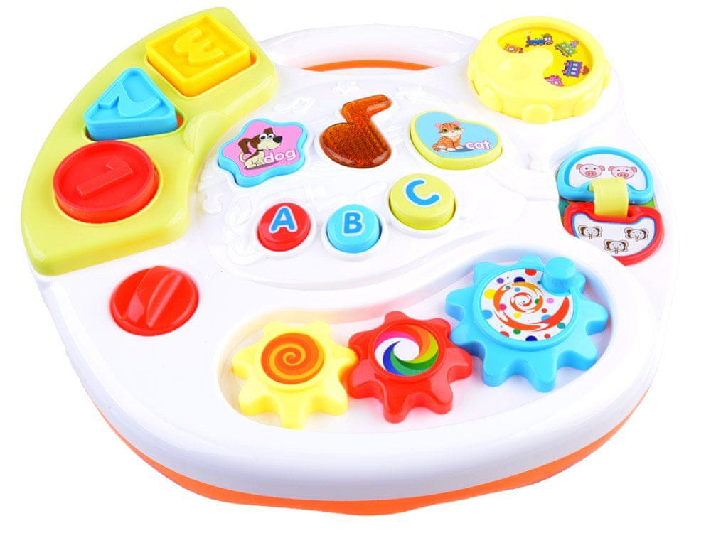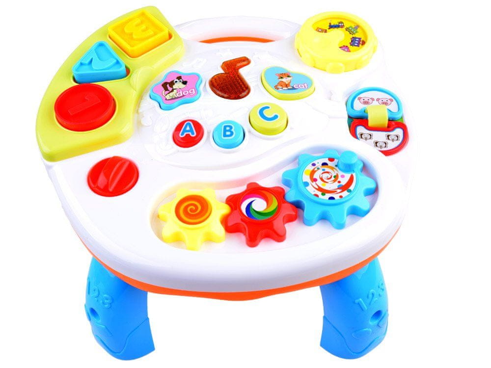 Igrača v privlačnih barvah bo vsakega malčka spodbudila k veseli igri. Miza ima široke, stabilne noge in zaobljene robove. Posamezni elementi so izdelani iz trpežnih materialov. Izobraževalna mizica je pakirana v privlačni embalaži, zato je idealna kot darilo za novega družinskega člana.
