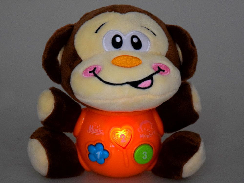 Interaktivna plišasta opica je popolna igrača za vsakega malčka.Igrača ima interaktivni trebušček z barvnimi osvetljenimi gumbi. Ostali deli igrače so mehki in prijetni. Igrača je izdelana iz mehkega pliša s plastičnim trebuhom. Velikost igrače je idealna za majhne otroške roke. Samo vzemite opico v roke in maskota že naleze radosten smeh.