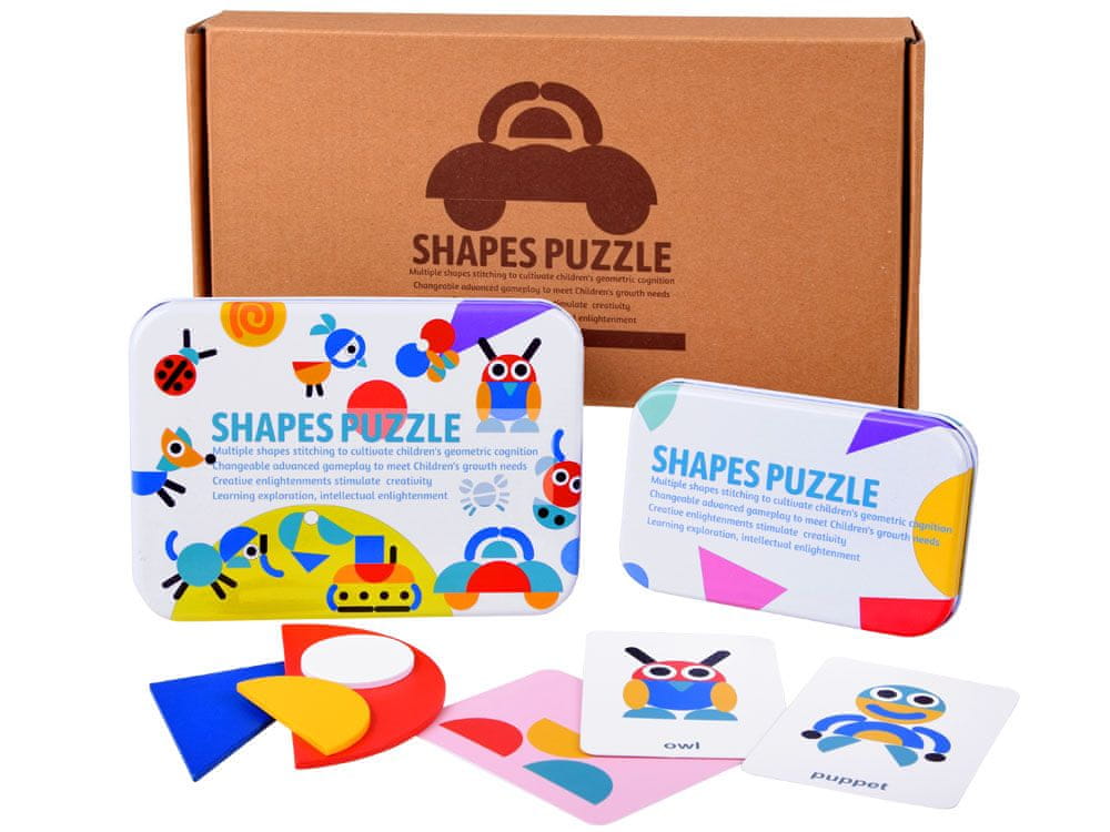 Lesena sestavljanka tangram je odlična ustvarjalna igrača, ki bo vašega malčka zabavala ure in ure, obenem pa podpira duševni razvoj. Zabavno je razporediti pravo sliko glede na priložene karte – bloke samo razporedite po vzorcih, narisanih na kartah. Sestavljanka daje veliko možnosti, poleg že pripravljenih plošč lahko sestavljanko sestavljate v poljubne podobe ali oblike, ki si jih izmisli otrok. Slike na kartah so podpisane v angleškem jeziku, kar bo še dodatno popestrilo zabavo pri učenju angleščine. Takšna uganka bo kot nalašč za šolske ustanove, kjer bo v pomoč pri razvoju logičnega in ustvarjalnega mišljenja. Zahvaljujoč zelo preprostim pravilom bo imelo igranje s Tangramom velik vpliv na odnose med generacijami, tako mlajšim kot starejšim bo omogočilo uresničevanje svojih intelektualnih sposobnosti. Ko je zabave konec, lahko vse koščke sestavljanke in karte skrijete v pisane pločevinke. Zahvaljujoč majhni velikosti imate lahko sestavljanko vedno pri sebi.