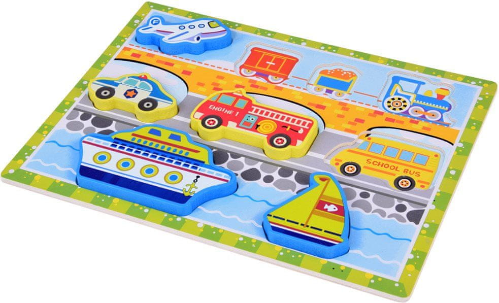 Drevesna sestavljanka združuje elemente učenja in igre. Med igranjem otrok vadi sposobnost primerjanja, opazovanja in fino motoriko. Hkrati se lahko otrok nauči imen različnih prevoznih sredstev. Igrača je bila izdelana s pozornostjo do podrobnosti in je za otroka popolnoma varna. Velike, trdne dele sestavljanke je enostavno dvigniti in jih namestiti v ustrezne luknje. Pisane ilustracije in zanimive barve otroka spodbujajo k igri in spodbujajo njegovo domišljijo. Otrokova naloga je, da koščke sestavljanke ujema z ilustracijami in oblikami na leseni plošči. S posameznimi vozili pa se lahko igra tudi samostojno in si izmišljuje zanimive zgodbe. Tabla vsebuje 9 elementov za vstavljanje. Dimenzije table: približno 30 cm x 22,5 cm x 1,5 cm