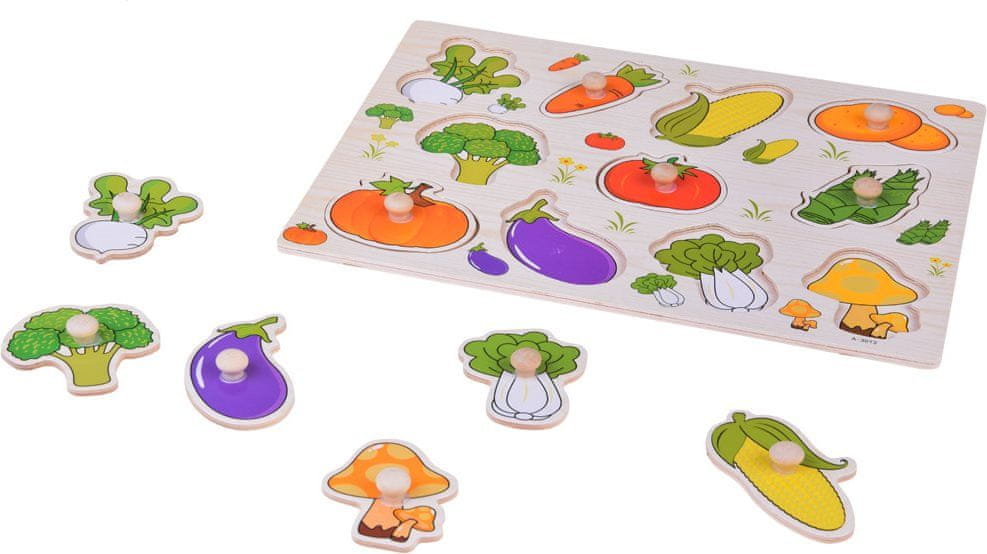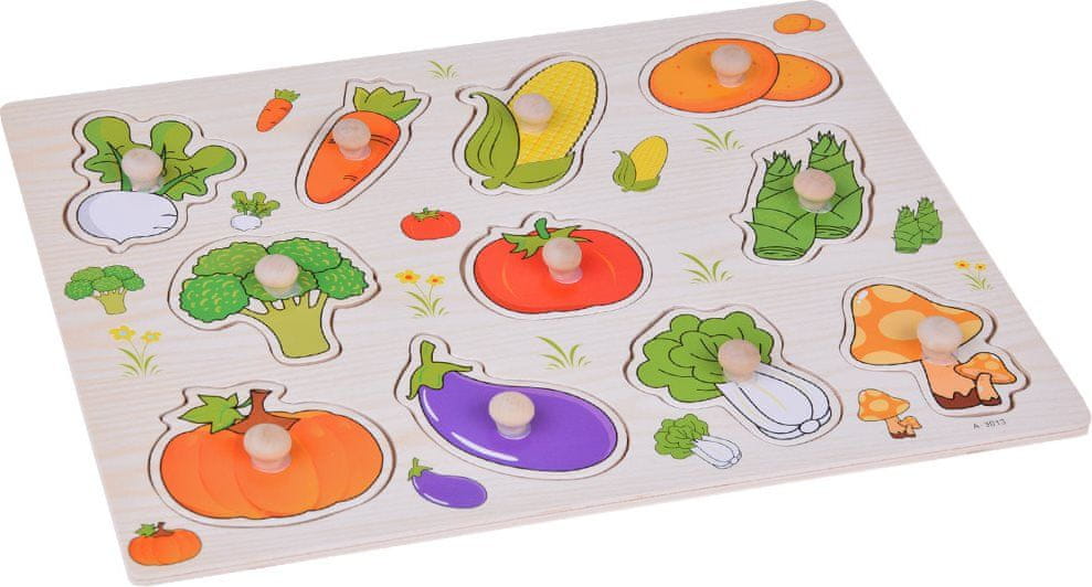 Drevesne sestavljanke so ena najboljših igrač za razvijanje logike in ustvarjalnosti pri otrocih. Otrokova naloga je, da na podlagi oblik in ilustracij prilagaja koščke ustreznim luknjam. Med igranjem otrok vadi fino motoriko, koordinacijo oko-roka, sposobnost primerjanja, opazovanje in logično razmišljanje. Zaradi barvitih ilustracij se bo otrok naučil prepoznavati različne vrste zelenjave in bo motiviran za učenje o zdravi prehrani. Značilnosti: