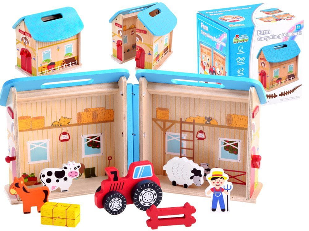 Krasna lesena kmečka hiša za živali bo zagotovo navdušila vsakega malega kmeta. Kmetija je v celoti izdelana iz lesa, je stabilna in barvita bo otrokom nudila veliko zabave za dolgo časa. Na kmetiji živijo krava, ovna, konj in kmet. Lesena kmetija za otroke lahko postane začetek velike pustolovščine.