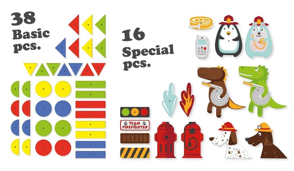 Ustvarjalna zabava se nikoli ne konča. S tem kladivom, koščki in plutovinasto tablo lahko ustvarite številne oblike gašenja požarov. Komplet vsebuje 38 barvnih kosov, 16 potiskanih posebnih kosov, kladivo in 60 žebljev ter plutovinasto tablo s potiskanim gasilskim motivom. Glavneznačilnosti: spodbuja ustvarjalnost in koncentracijospodbuja fino motoriko