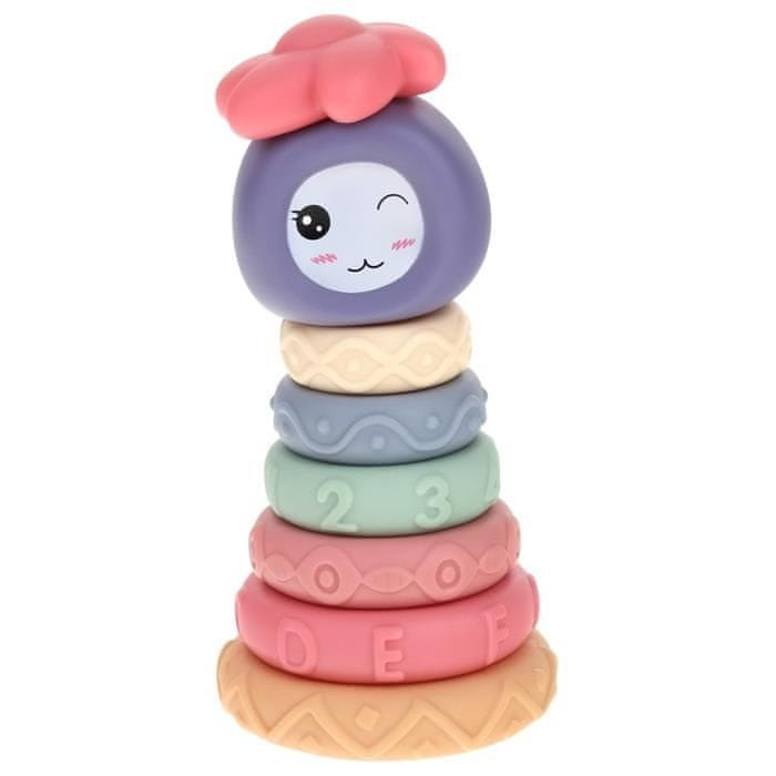 Pisana piramida, sestavljena iz 6 obročev, glave in mehke rože je idealna igrača za najmlajše. Zahvaljujoč njej lahko otrok razvije svoje ročne spretnosti in vizualno zaznavo. Obroči so različnih barv in velikosti, malček lahko razporeja velikosti enega za drugim in tako vadi sposobnost organiziranja predmetov po velikosti. Poleg tega imata dva obroča številke (1–8) in osnovne črke (AH). Stolp, ki otroka spodbuja k prepoznavanju oblik in velikosti ter s tem k prepoznavanju vzročno-posledičnih povezav.